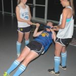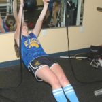A “field-expedient” compound movement targeting the back and biceps muscles. Two spotters face each other holding the ends of a bar (or hockey stick) firmly by their hips. The lifter grasps the bar/stick with a wide overhand (pull-up) grip, leaning back with the feet as far forward as possible, and pulls herself up chest up until the chest touches the bar/stick). This can also be done with an underhand (chin-up) grip to focus more on the biceps.